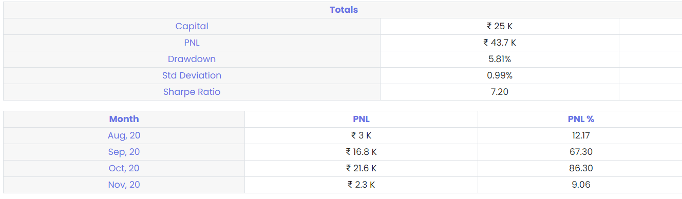 तो देखा आपने इस स्ट्रेटेजी ने मात्र रु.२५००० के Capital पर ०१ सप्टेम्बर २० से १७ नोव्हेंबर २० तक रु.४३१८१ का मुनाफा कमा के दिया है. ये स्ट्रेटेजी मुझे बहोत ख़ास लगती है और ये एकदम मुफ्त है. और इस algo trading software की खासियत ये है की इसमें आपको दिनभर मार्केट के सामने बैठ के भाव को देखते रहने की जरूरत नहीं. आपने एक बार मोर्निंग में login कर के टोकन generate करलिया की ये software खुद ही आपके लिये ट्रेड लेता है और Buy, Sell & stop loss लगता है.